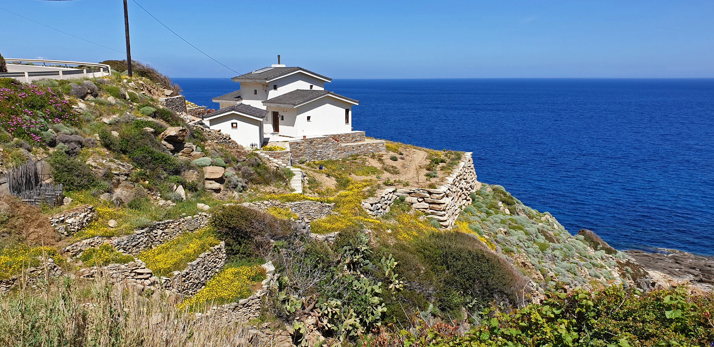 Op initiatief van beide opdrachtgevers is gekozen voor een architectonische inpassing die aansluit op de oorspronkelijke bebouwing van het eiland. Doordat dit deel van de Egeische zee in het verleden door rovers en piraterij werd gedomineerd zijn de bouwwerken zeer onopvallend in het landschap verweven. Een eenvoudig volume, diepe negges, lage goothoogde en flauwe dakhelling zorgen er voor een aansluiting op de architectuur van het eiland. Voor de gevel is de materiaalkeuze hierdoor ook op de stenen van de rots zelf gevallen.